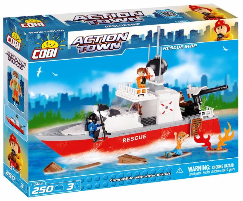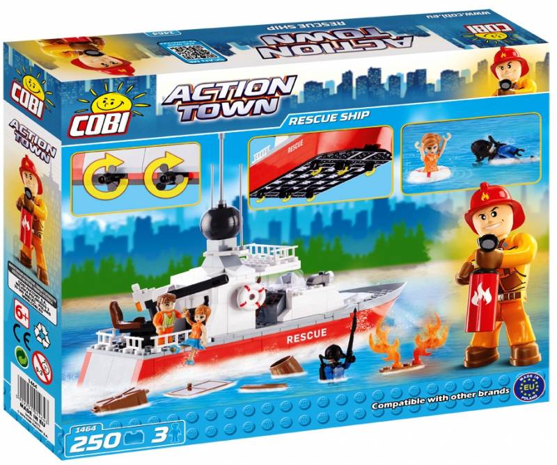 Легосовместимый конструктор серії Action Town Cobi -1464, виробництва Польща, кількість елементів - 250, кількість фігурок - 3, для дитини від 6-ти років, розмір упаковки 28*5,5*24см.Берегова охорона готується до порятунку на воді. Рятувальна команда отримала повідомлення про аварію. Катер рятувальників вже готовий! На борту є вода для гасіння пожеж, рятувальний круг, спеціальний гарпун. Катер переміщається з допомогою гвинтів і у нього є колеса, що б було цікаво гратися на підлозі. В набір входить 250 цеглинок Cobi і 3 фігурки рятувальників.