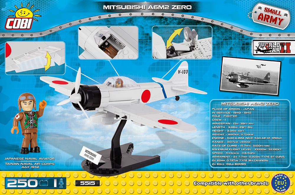 Захоплюючий конструктор, легосовместимый, серії: Small Army WWII, для дитини від 6-ти років. Японський легкий палубний винищувач часів II Світової війни. Випускався з 1940 по 1945 рік, всього побудовано 10 939 літаків. В останні місяці війни використовувався для атак камікадзе.В набір входить 250 цеглинок Cobi і 1 фігурка. Розмір зібраної моделі 28*33,5*13см.