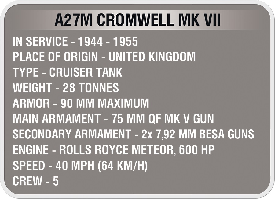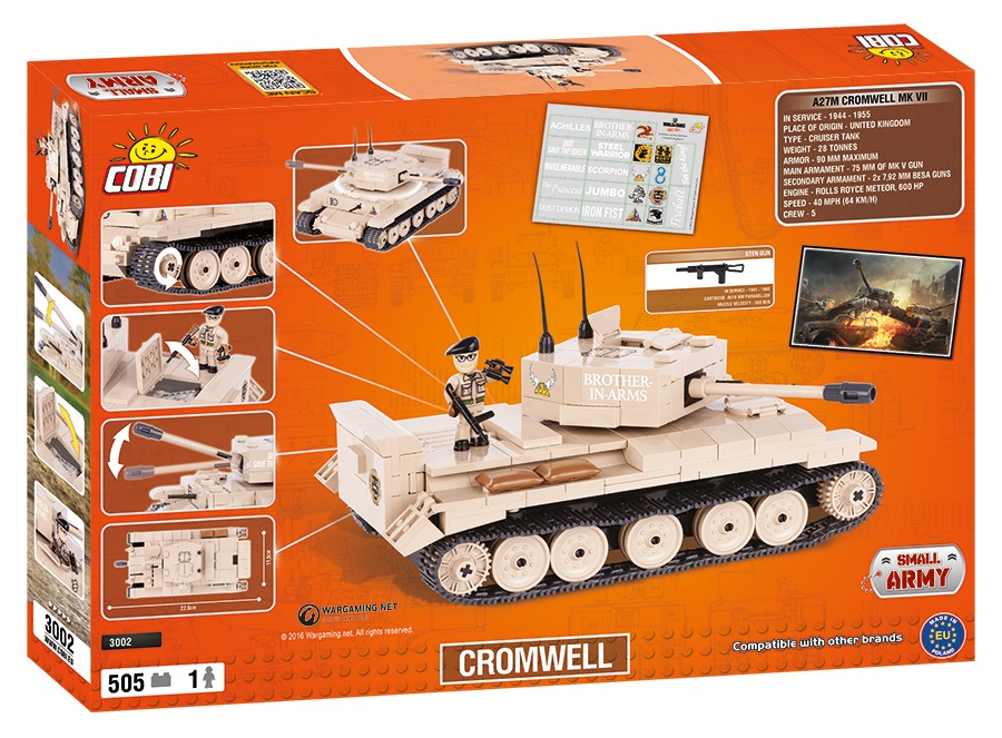 Захоплюючий конструктор, легосовместимый, серії: World Of Tanks, для дитини від 8-ми років. Ліцензійний набір, танк Кромвель з извесной комп'ютерної on-line гри World of Tanks. В комплекті 2 бонус-коду від World of Tanks.В набір входить 505 цеглинок Cobi , лист з наклейками і 1 фігурка. Розмір зібраної моделі 22,5*11,5*11,5 див.