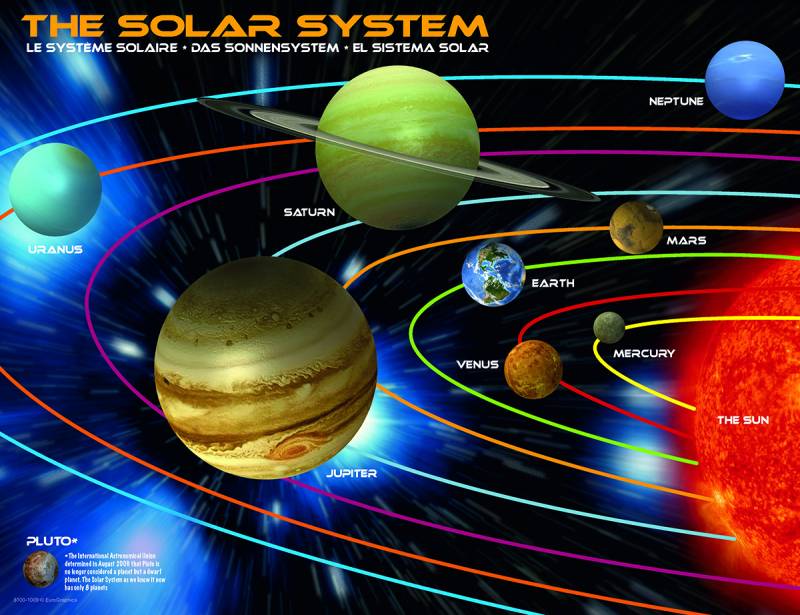 Сонячна система, в основному, порожній простір. Планети - Меркурій, Венера, Земля, Марс, Юпітер, Сатурн, Уран і Нептун вельми обмежені в розмірі в порівнянні з простором між ними.