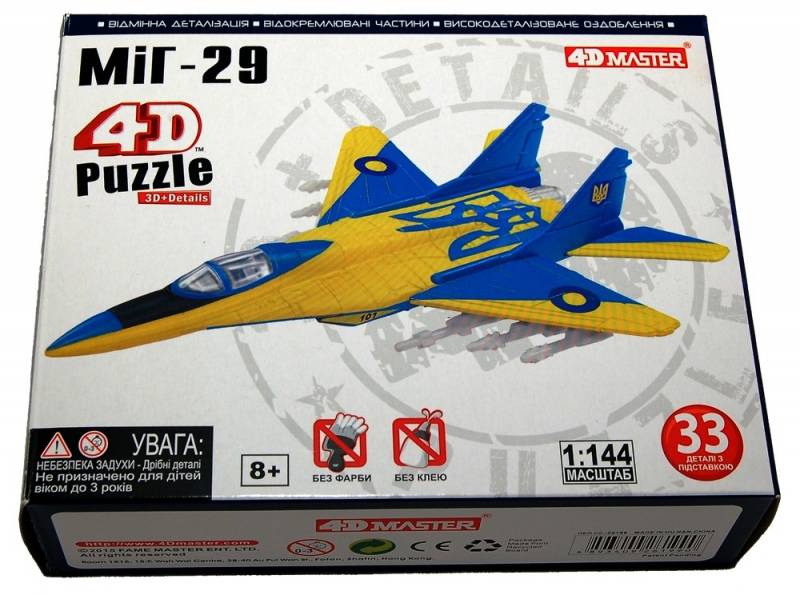 Об'ємний пазл Літаки Міг-29, на ряду з Су-27 є основними літаками истрибительной авіації Повітряних сил Збройних Сил України. Легкий винищувач Міг-29, розроблений в першій половині 1970-х років ОКБ Міг, поступив на озброєння в 1983 році. За класифікацією НАТО літак має позначення Fulcrum (Точка опори). Пройшовши кілька етапів модернізації з моменту початку виробництва, Міг-29 випускається і зараз. Літак раскашен в національний жовто-синій колір, модель мамолета в масштвбе 1:144