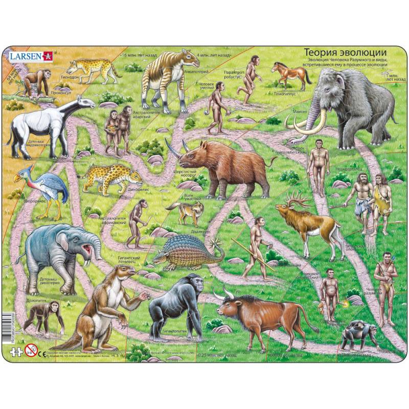 Путь от обезьяны до человека занял около 65 миллионов лет. Какие наиболее известные животные жили в в это время, как проходила эволюция? Собрав этот пазл ребенок получит ответы на многие вопросы.Компания Larsen и сейчас работает, придерживаясь тех же идей, которыми руководствовался основатель компании: качественные пазлы должны быть сделаны из плотного картона. Это дает ребенку возможность крепко держать части пазла, а также предохраняет от разрывания и расслаивания; количество частей пазла должно соответствовать иллюстрации и возрасту детей, для которых этот пазл предназначен; пазл должен быть оснащен подложкой и рамкой, что облегчает не только процесс игры детей, но также решает и вопрос хранения; лучше предоставлять детям пазлы, которые они смогут собрать несколько раз, чем те которые окажутся сложными для них. Если пазл очень сложный для ребенка, он просто потеряет терпение в процессе складывания; когда ребенок складывает пазл несколько раз подряд, он запоминает формы частей пазла и их месторасположение. Поэтому важно придавать частям пазла различные формы. В процесі запам'ятовування форм частин пазла дитина набуває навик того, як запам'ятовувати інші форми, такі як букви і слова при читанні.