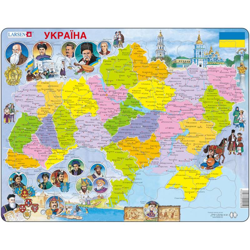 Фізична карта України з назвами міст, річок, озер та гір. Навколо карти найбільш відомі історичні особистості, які внесли свій вклад у розвиток української державності.Компанія Larsen і зараз працює, дотримуючись тих же ідей, якими керувався засновник компанії: • якісні пазли мають бути зроблені з щільного картону. Це дає дитині можливість міцно тримати частини пазла, а також оберігає від розривання і розшаровування; • кількість частин пазла повинно відповідати ілюстрації та віком дітей, для яких цей пазл призначений; • пазл должен быть оснащен подложкой и рамкой, что облегчает не только процесс игры детей, но также решает и вопрос хранения; • лучше предоставлять детям пазлы, которые они смогут собрать несколько раз, чем те которые окажутся сложными для них. Если пазл очень сложный для ребенка, он просто потеряет терпение в процессе складывания; • когда ребенок складывает пазл несколько раз подряд, он запоминает формы частей пазла и их месторасположение. Поэтому важно придавать частям пазла различные формы. В процесі запам'ятовування форм частин пазла дитина набуває навик того, як запам'ятовувати інші форми, такі як букви і слова при читанні.