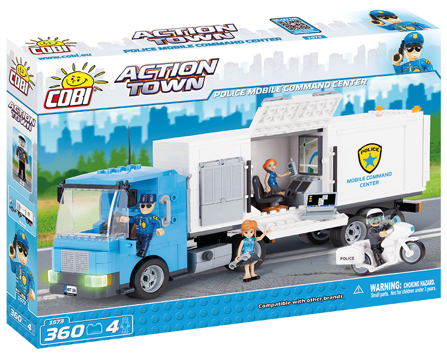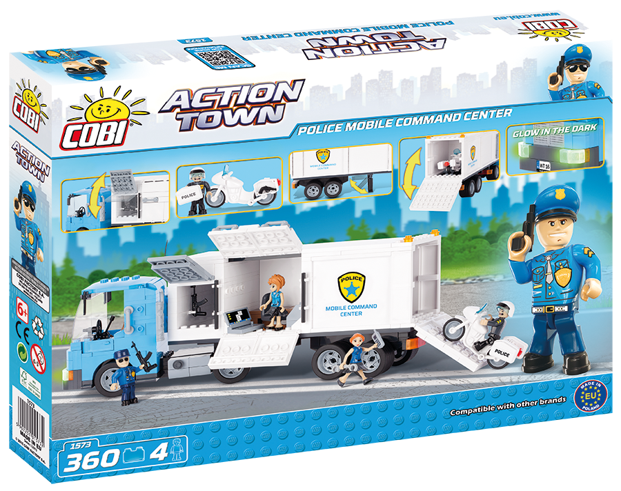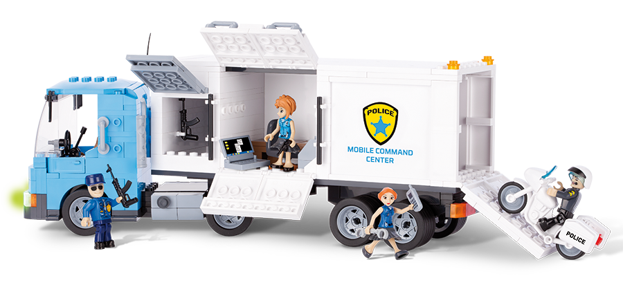 Поліція тепер має дивовижний мобільний командний центр. Тут спецслужби вирішують найскладніші завдання зі злочинністю, і в той же час можна швидко дістатися до потрібного місця. Вантажівка з світяться в темряві елементами і люком, де перевозиться зброя. Збоку, ви також можете відкрити головне місце команди, де є комп'ютер і крісло для поліцейського. В задню частину машини може легко в'їхати патрульний мотоцикл через відкидаються двері. Вантажівка після складання довжиною 29,3 см і високі 11 см. У наборі 360 цеглинок і 4 фігурки, так само є додаткові елементи: зброя, рація, наручники і комп'ютер.