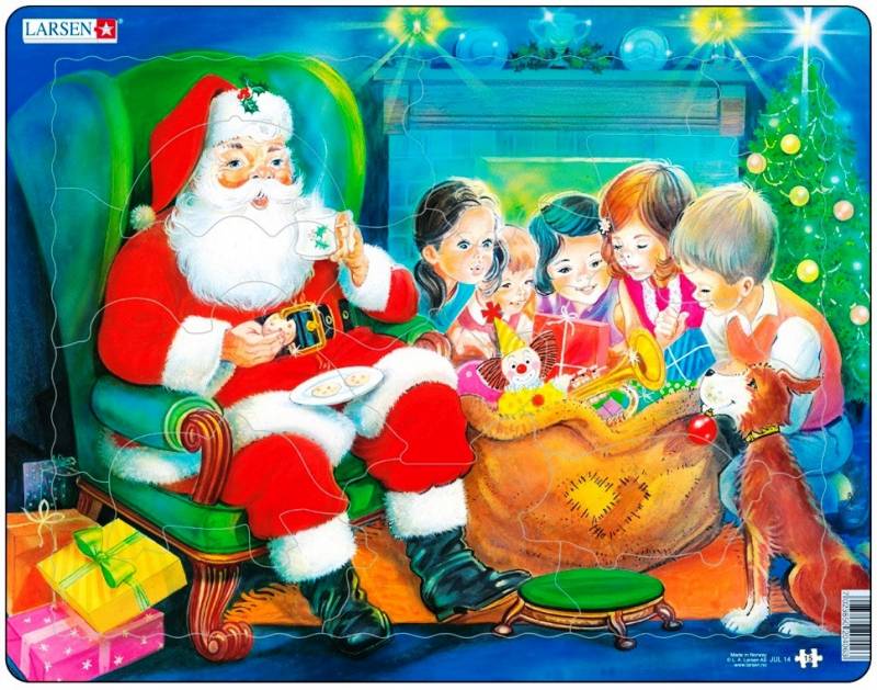 Пазли для маленьких дітей від 3-х років, кількість елементів 15, вони виконані у вигляді різних фігурок, а рамка-вкладиш має відповідну насічку, серія Мультфільми, розмір в зібраному вигляді 36,5*28,5 див. У Діда Мороза багато роботи в переддень Нового року всі діти чекають на подарунки. Втомився Дід Мороз, присів відпочити. Цей пазл чарівний і складається з фігурок-сюрпризів з мішка Діда Мороза.