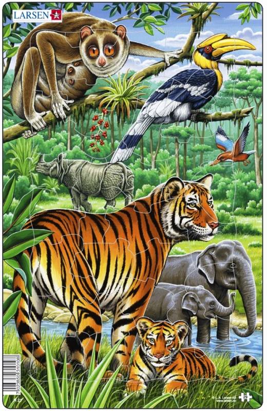 Пазли для маленьких дітей від 3-х років, кількість елементів 29, вони виконані у вигляді різних фігурок, а рамка-вкладиш має відповідну насічку, серія Фауна, розмір в зібраному вигляді 28,5*18,3 див. В тропічних заростях живе дуже багато мешканців. Для кожного знайдеться містечко: і для грізних тигрів, і для добрих слонів. Склади пазл і ти познайомишся з мешканцями джунглів.