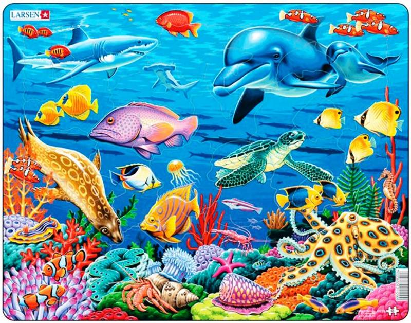 у тропічних морях на мілководді утворюються коралові рифи. У теплих водах і химерних формах коралів можна зустріти багато різних мешканців. Склади пазл і побачиш хто живе поруч з акулою і восьминогом.